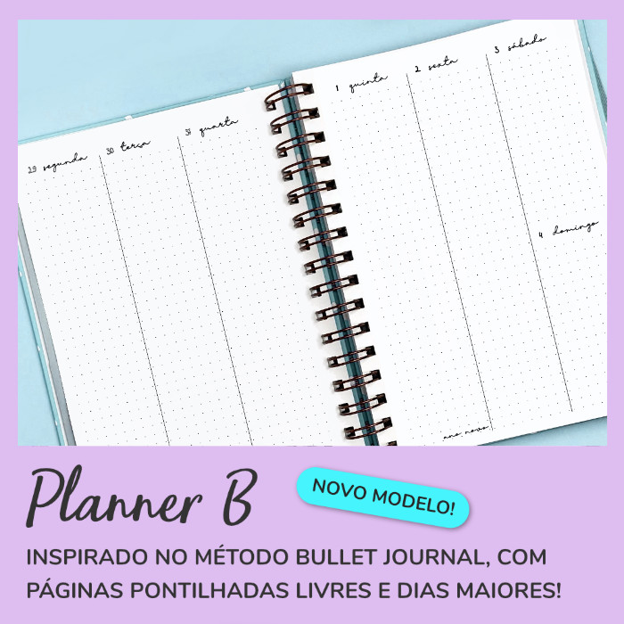 Esse é o nosso Planner B, nosso modelo inspirado no método Bullet Journal – com muito pontilhado livre para você criar planejamentos e decorar como quiser! Você escolhe o tipo de papel, se quer anual (12 meses) ou semestral (6 meses), com datas de 2026, ou sem datas.